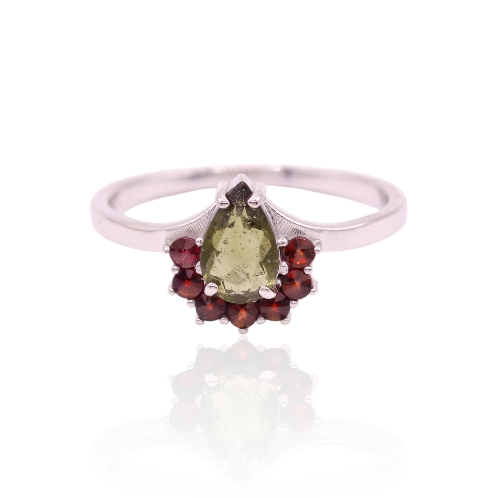 Moldavite ring 7x5 mm with garnets Ag 925/1000